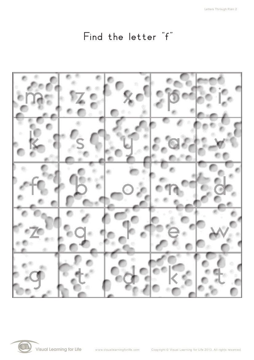 In the “Letters Through Rain” worksheets, the student must compare the features of any similar looking letters, in order to distinguish between them. These worksheets form part of the Visual Perceptual Skills Builder - Level 1 For more information please visit: www.visuallearningforlife.com or follow Visual Learning for Life on Facebook