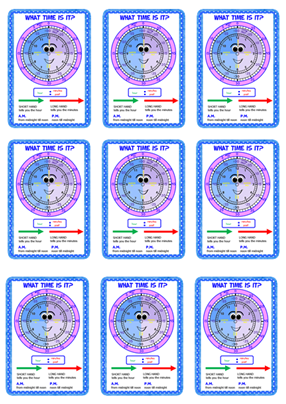 Time Poster in 3 sizes: Classroom Display Poster: 1 per page can be copied onto A4, enlarged to A3 or even bigger Student Cards: 4 per page for individual students Bookmarks: 9 per page A quick reference poster or card for students who have difficulty learning to tell the time. This poster helps students to: - calculate minutes past and minutes to the hour
