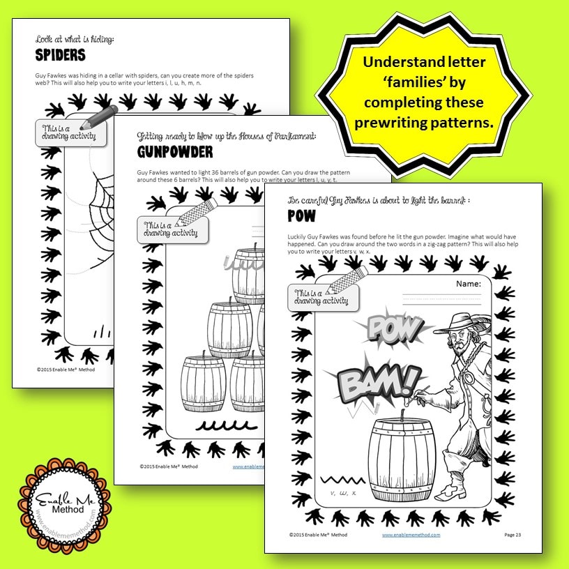 It uses an award winning writing font teaching children where to start, which direction to write and where to stop. This is particularly useful for children with dyslexia, dyspraxia and for those who are slow writers. Created by myself, I use occupational therapy techniques to improve a child’s writing throughout the pack by using a developmental process. Every page naturally progresses the skill of writing. It starts with how to sit and hold a pencil, progressing to drawing letter groups, tracing words, copying words, reducing letter size, creating sentences and ending with story writing. There is also a thesaurus maker for those children who repeatedly use the same word in every story. The best bit is that they have no idea how much this resource is improving their handwriting as they are interested in learning more about Guy Fawkes and how he tried to blow up the Houses of Parliament in Britain. I use it and I know it works You do not need to think of anything as it has been done for you! Just print out and use. There are 30 pages of worksheets and guidance notes. Suitable to whole class, small groups and 1 to 1 sessions. ***************************************************************************** Read how I use this product everyday ***************************************************************************** Terms of Use Copyright © Enable Me Method. All rights reserved by author. This product is to be used by the original downloader only. Copying for more than one teacher, classroom, department, school, or school system is prohibited. This product may not be distributed or displayed digitally for public view. Clipart and elements found in this PDF are copyrighted and cannot be extracted and used outside of this file without permission or license. Intended for classroom and personal use ONLY.