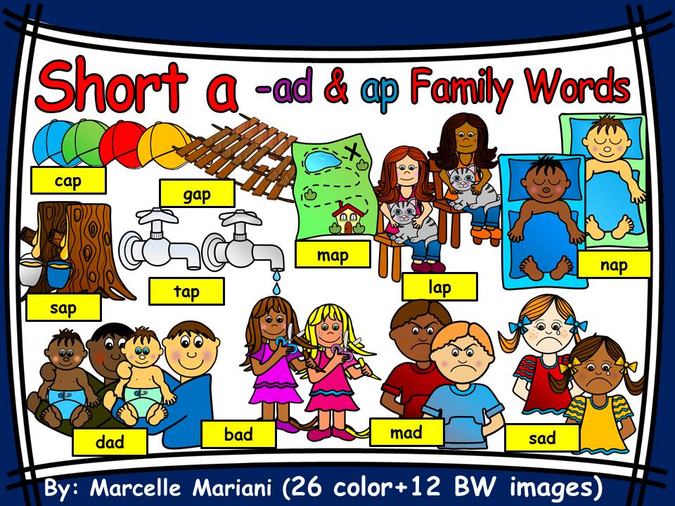 This package consists of PNG high resolution 300dpi word family words cliparts for family words: -at, -an, -ad, -am, -ab, -ap, and -ag.