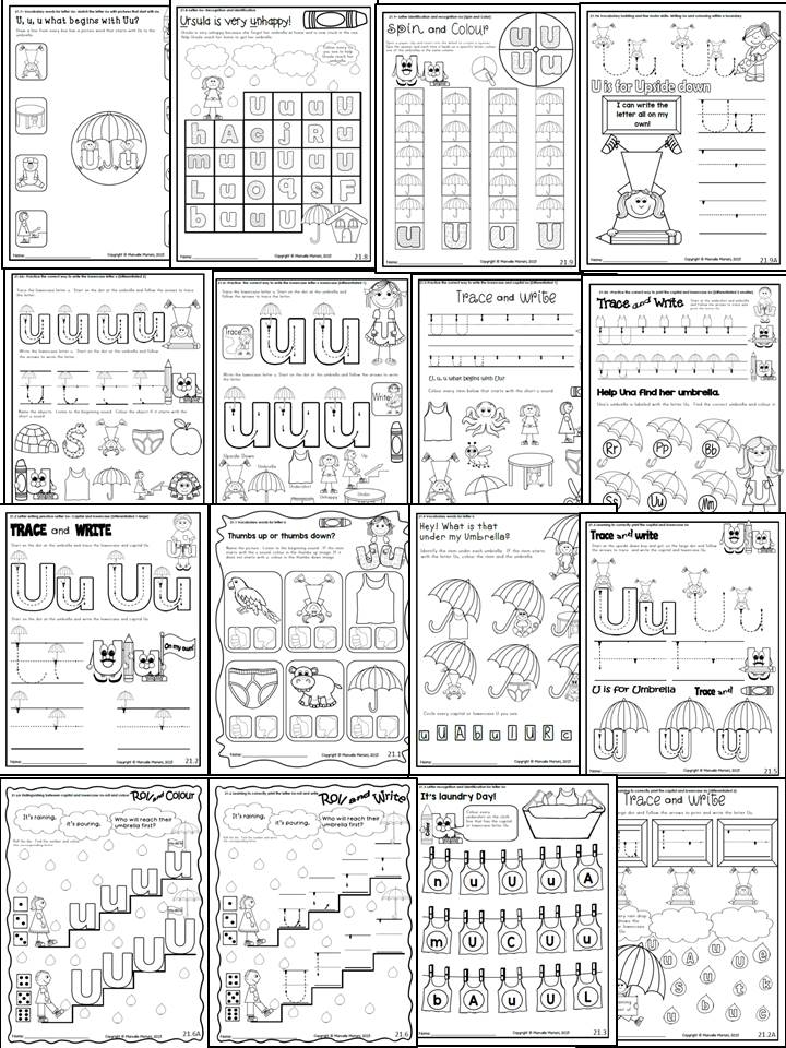 *Some of the tools used here take into assumption that children have already learned letters A-T so some of the worksheets reflect on previous letters as well as letter u. Every package follows a sequence and will include items that include past letters in the alphabet sequence.
