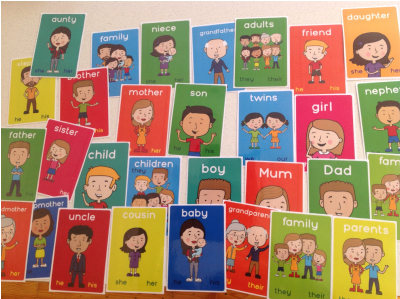Families are made up of many different people who have different titles. This is a useful teaching resource when students are learning to name family members (mother, father, sister, brother, grandmother, grandfather, uncle, aunty, cousin, niece, nephew, son, daughter, etc.). On the cards I have also included the pronouns relevant to that family member.