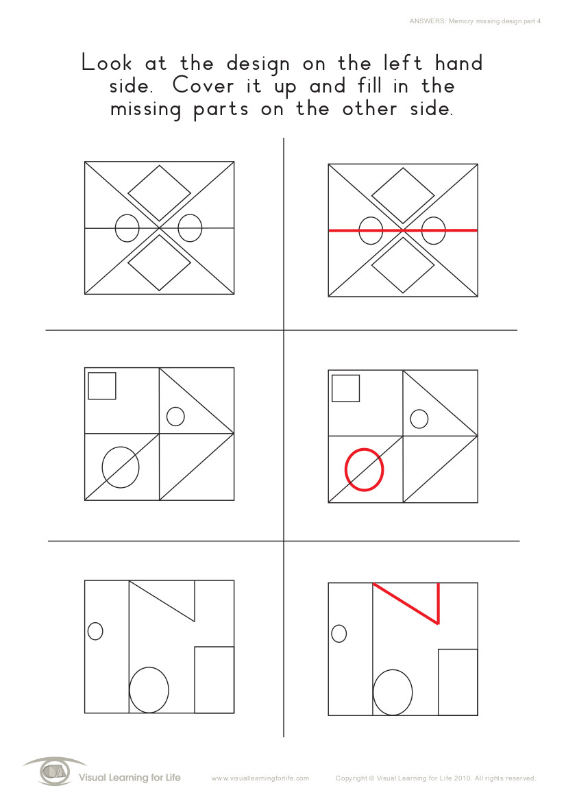 In the “Memory Missing Design Part” worksheets, the student must fill in the missing pieces in the design on the right side in order to complete it. These worksheets form part of the Visual Perceptual Skills Builder - Level 2 For more information please visit: www.visuallearningforlife.com or follow Visual Learning for Life on Facebook