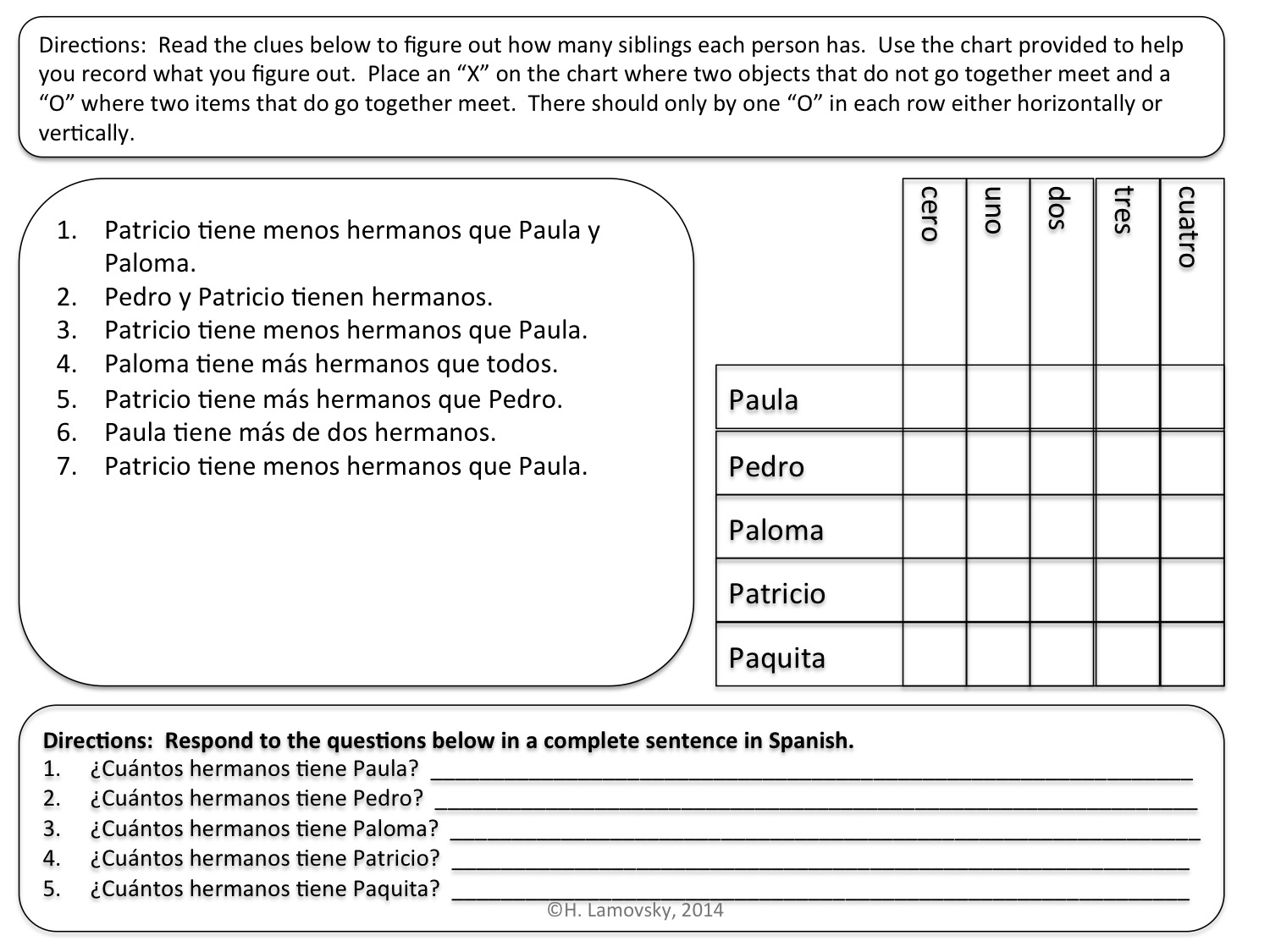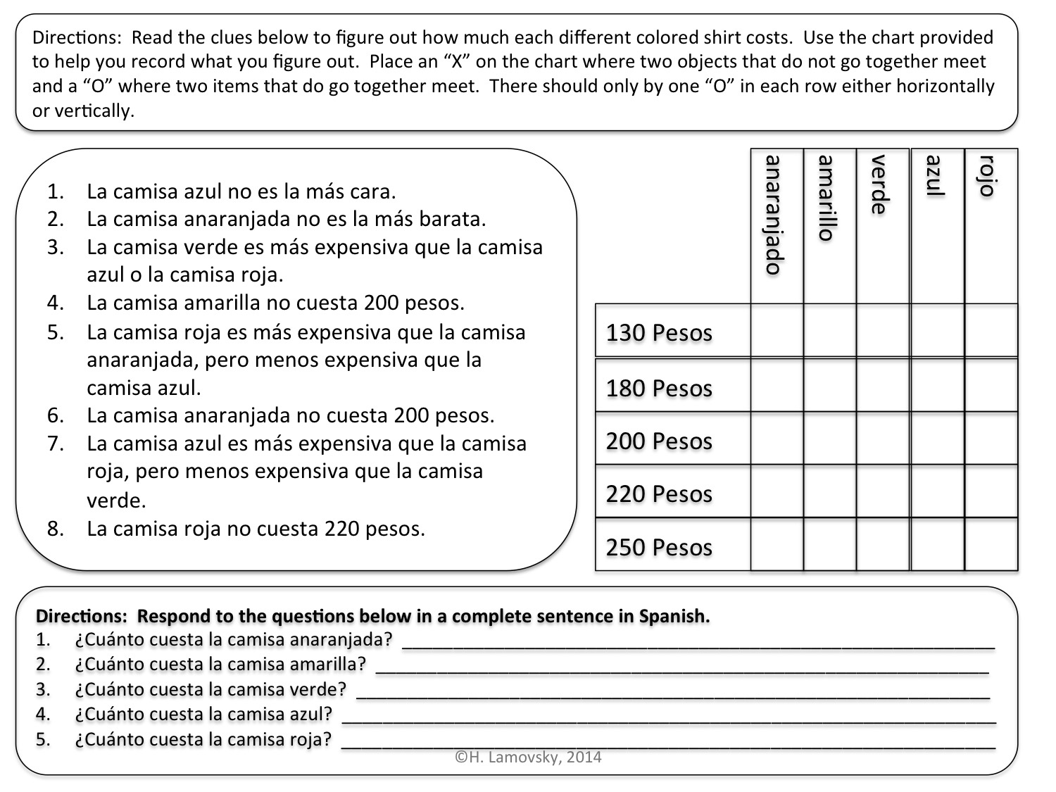 Keywords: Spanish logic problems, logic puzzles, higher order thinking, reading activities, places, weather, school, animals, food, colors, numbers, sports, spanish speaking countries