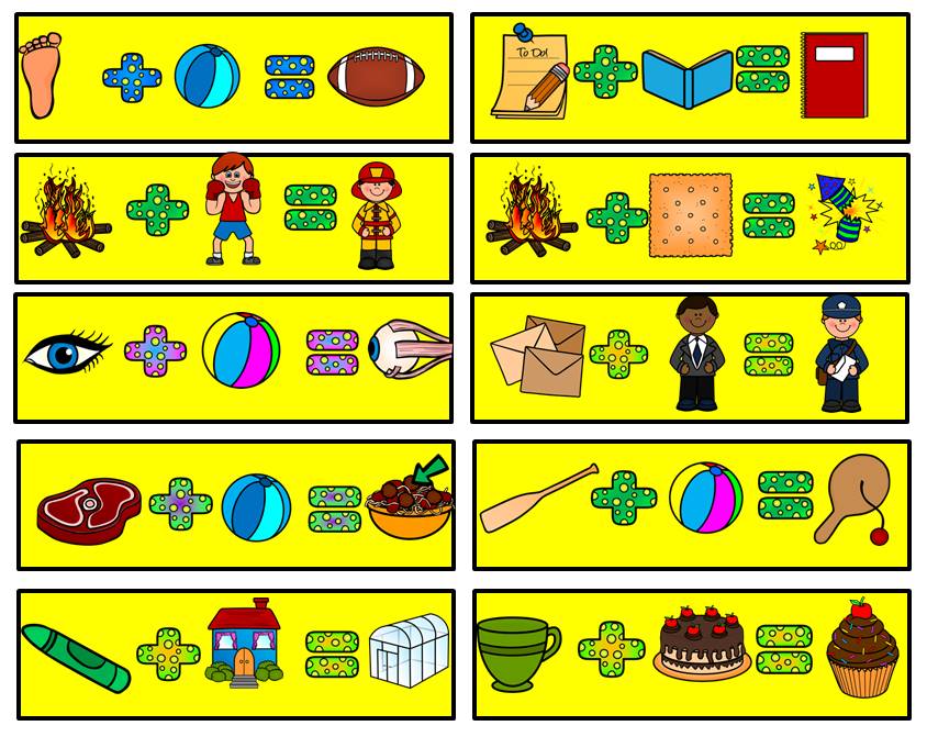 1. arm 2. Armchair 3. Ball 4. Basket 5. Basketball 6. Bird 7. Birdhouse 8. Boat 9. Boathouse 10. Book 11. Bookshelf 12. Bow 13. Bowl 14.Box 15. Brush-hair 16. Brush-paint 17. Butter 18 Buttercup 19. Butterfly 20.cake 21. chair 22. club 23. clubhouse 24. cracker 25. cup 26. cupcake 27. day 28. daylight 29. dog 30. doghouse 31. dragon 32. dragonfly 33. ear 34. earring 35. eye 36. eyeball 37. fighter 38. fire 39. firecracker 40. firefly 41. fireman 42. fish bowls 43. fish 44. flash 45. flashlight 46. fly 47. foot 48. football 49. gold 50. goldfish 51. green 52. greenhouse 53. house 54. jelly 55. jellyfish 56. light 57. lighthouse 58. lip 59. lipstick 60. mail 61. mailbox 62. mailman 63. man 64. meat 65. meatball 66. melon 67. note 68. notebook 69. paddle 70. paddleball 71. pan 72. pancake 73. rain 74. rainbow 75. ring 76. shelf 77. snow 78. snowball 79 snowman 80. star 81. starfish 82. stick 83. stop 84. stoplight 85. tooth 86. toothbrush 87. water 88. watermelon 89. wheel 90 wheelchair If you have any questions or concerns, please do not hesitate to contact me at marcellemariani@gmail.com