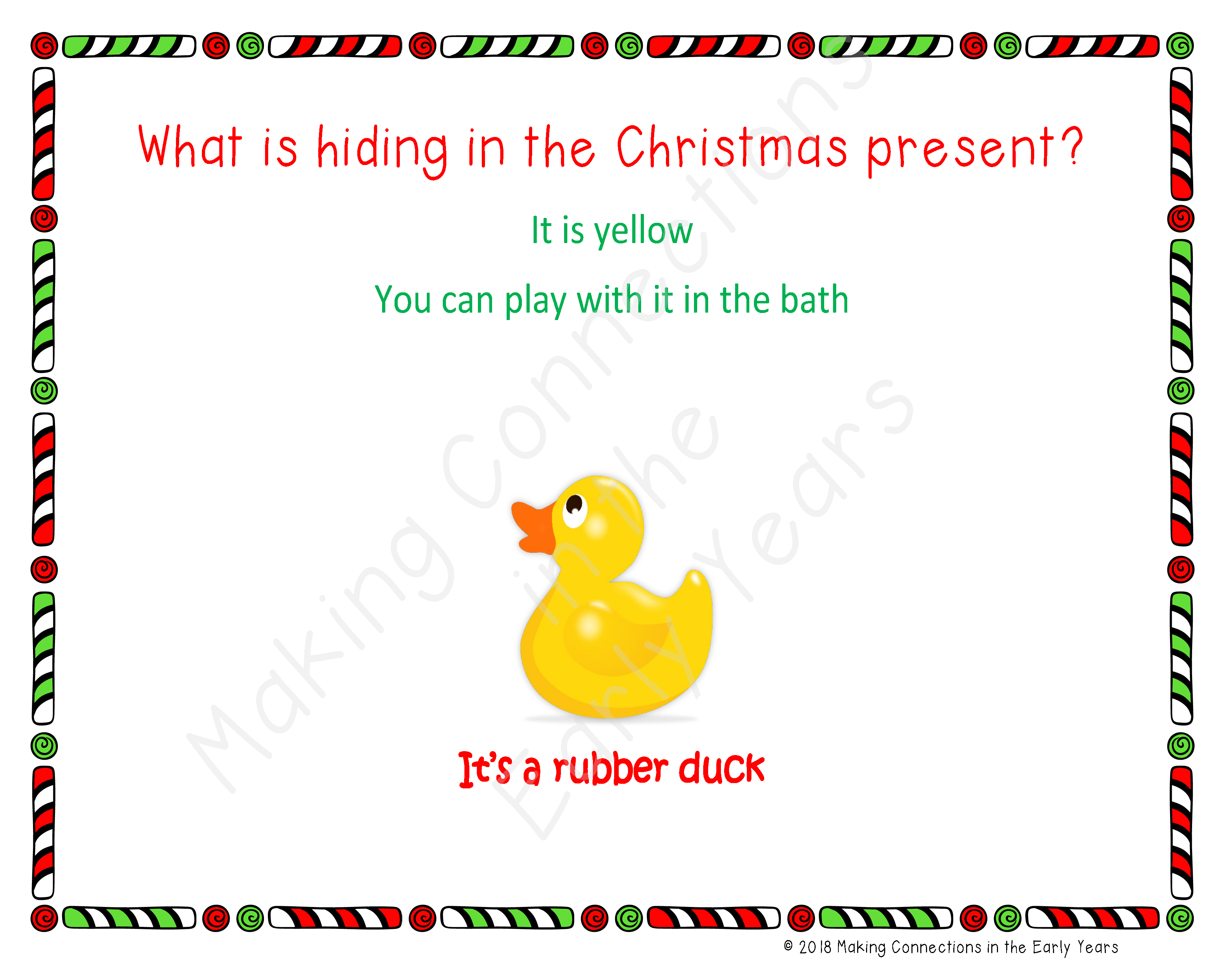 - Black and white ‘What is hiding in the Christmas present?’ print out for students to make their own inference activity.