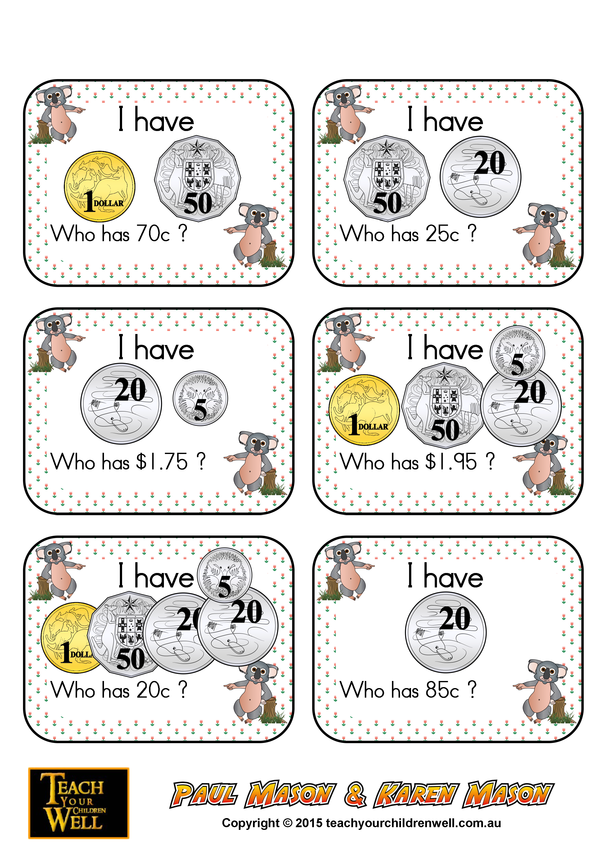 CARD SETS 1 to 5 Australian Money - I have, who has - contains 30 cards-Set 1....... (5c to $2.00) Coins Australian Money - I have, who has - contains 30 cards-Set 2....... (5c to $5.00) Coins Australian Money - I have, who has - contains 30 cards-Set 3....... ($1.00 to $10.00) Coins Australian Money - I have, who has - contains 30 cards-Set 4....... ($5.00 to $200.00) Notes Australian Money - I have, who has - contains 30 cards-Set 5....... ($5.00 to $100.00) Coins & Notes
