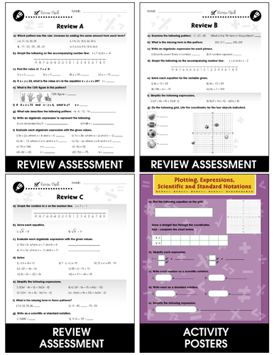Get excited about more advanced algebraic equations as you introduce linear functions. Our resource provides warm-up and timed drill activities to practice procedural proficiency skills. Graph the solution to "x" on a number line. Find the missing numbers in the equations. Substitute a number for "x" to find the value of an expression. Write algebraic expressions to represent each verbal expression. Simplify expressions using the distributive property. Plot an equation on a grid. Solve the proportions. Write numbers as a scientific notation. Identify the rule that governs a pattern. The drill sheets provide a leveled approach to learning, starting with grade 6 and increasing in difficulty to grade 8. Aligned to your State Standards and meeting the concepts addressed by the NCTM standards, reproducible drill sheets, review and answer key are included.