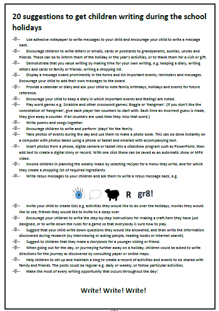 Parents and teachers are often concerned at the loss of skills during the school holidays. These fun activities, easily incorporated into any holiday schedule, can ensure the children get essential practice and maintain their skills in writing. There are twenty different suggestions to spark the imagination. The suggested activities are suited to students from Prep to mid-Primary years though some may required adaption to match a child's development and interest. The resource is free to download, print and distribute to parents. You can read more about these suggestions on my blog. Happy teaching and learning, Norah